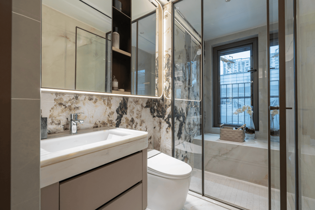 值得一提,保利戳中女性需求,主卫新增科勒美妆龙头,水流角度贴合化妆、护肤需求;主卫镜柜嵌入美妆冰箱,贴心存储口红、面膜等护肤品。